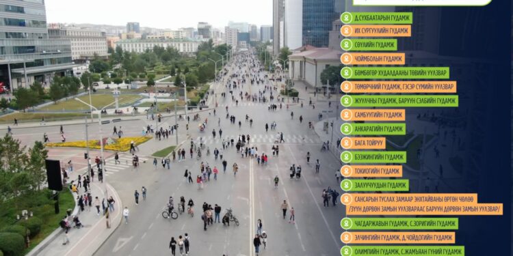Жанжин Д.Сүхбаатарын талбай (Д.Сүхбаатарын гудамж, Их сургуулийн гудамж)  Сөүлийн гудамж, Чоймболын гудамж, Бөмбөгөр худалдааны төвийн уулзвар, Жуулчны гудамж, Баруун сэлбийн гудамж, Төмөрчний гудамж, Гэсэр сүмийн уулзвар, Самбуугийн гудамж, Анкарагийн гудамж, Бага тойруу, Бээжингийн гудамж, Залуучуудын гудамж, Сансарын туслах замаар Энхтайваны өргөн чөлөөний Зүүн дөрвөн замын уулзвараас Баруун дөрвөн замын уулзвар, Чагдаржавын гудамж, С.Зоригийн гудамж, Элчингийн гудамж, Олимпийн гудамж, Гэндэнгийн гудамж, Д.Чойдогийн гудамж, С.Жамъяан гүний гудамж, Чингисийн өргөн чөлөөний Монголын хүүхдийн ордны уулзвараас Монгол шуудангийн уулзвар болон дотогш замуудын хөдөлгөөнийг 9 дүгээр сарын 13-ны Бямба гарагт 07:00-18:00 цагийн хооронд түр хугацаагаар хязгаарлана. Мөн НЭМГ-ын харьяа байгууллагууд, хувийн хэвшлийн эрүүл мэндийн байгууллагууд үзлэг, зөвлөгөө мэдээлэл өгнө. Эрүүл мэндийн байгууллагууд амны хөндийн эрүүл мэндийн үзлэг, чихрийн шижингийн илрүүлэг, цусны даралт ихсэх өвчний зөвлөгөө, сүрьеэгийн илрүүлэг, дасгал хөдөлгөөний зөвлөгөө, эрүүл хооллолтын зөвлөмж мэдээлэл өгнө.