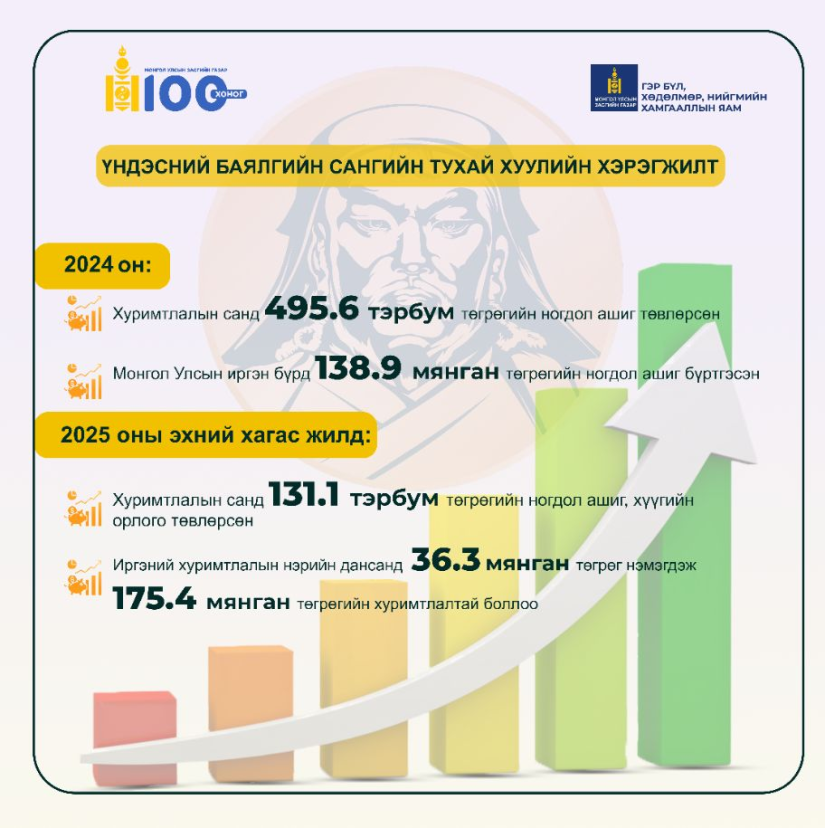 Үндэсний баялгийн сангийн тухай хуулийг хэрэгжүүлж эхэлснээр 2024 онд хуримтлалын санд 495.6 тэрбум төгрөгийн ногдол ашиг төвлөрсөн. Монгол Улсын иргэн бүрд хуваарилж нэг иргэнд 138.9 мянган төгрөгийн ногдол ашиг бүртгэсэн юм.
